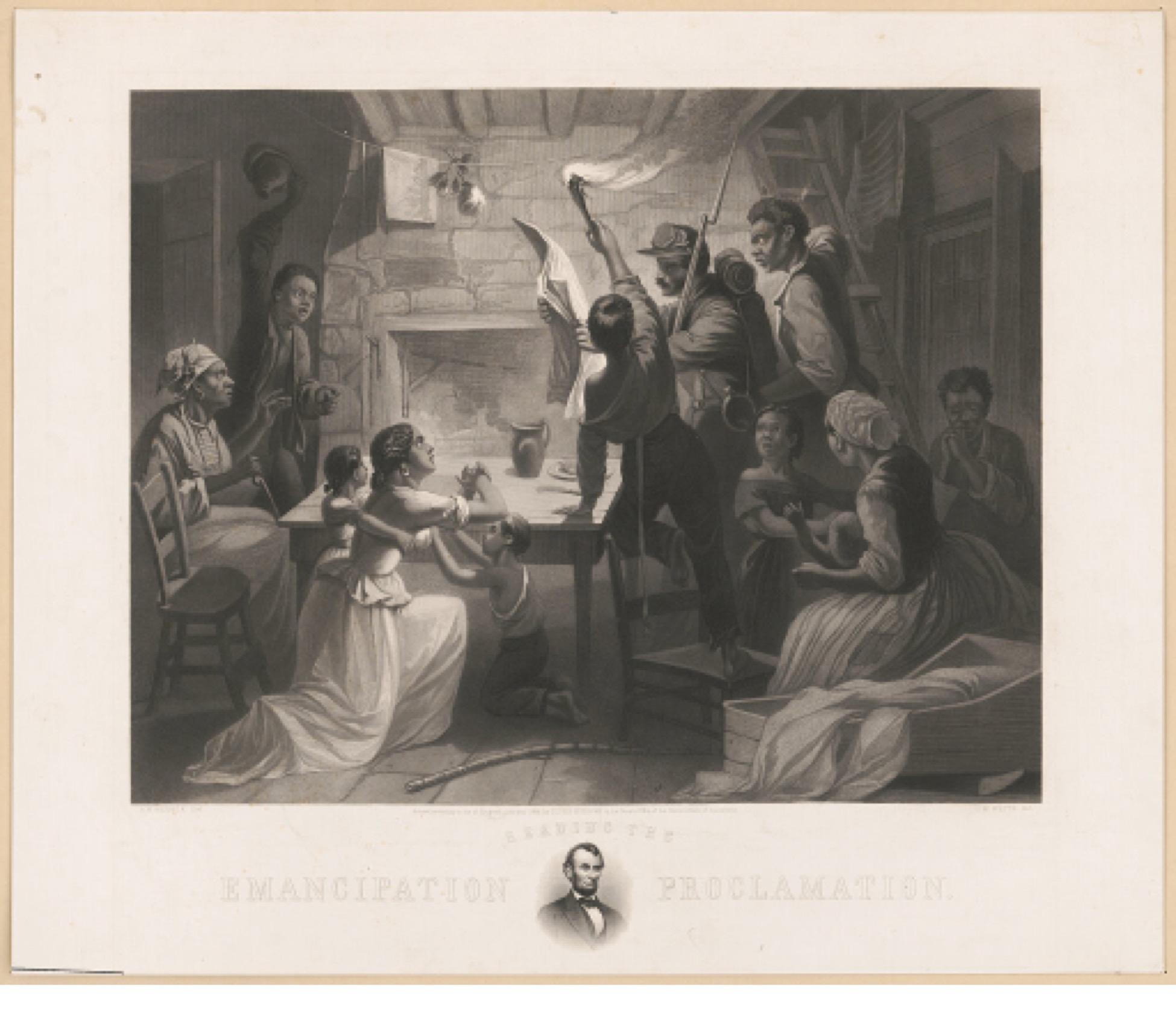 This image of a family of slaves reacting to the astonishing news of the 1863 Emancipation Proclamation is one of several variations widely published. Mass-produced lithographs like these were frequently displayed prominently in homes and represent an important aspect of American history and popular culture.